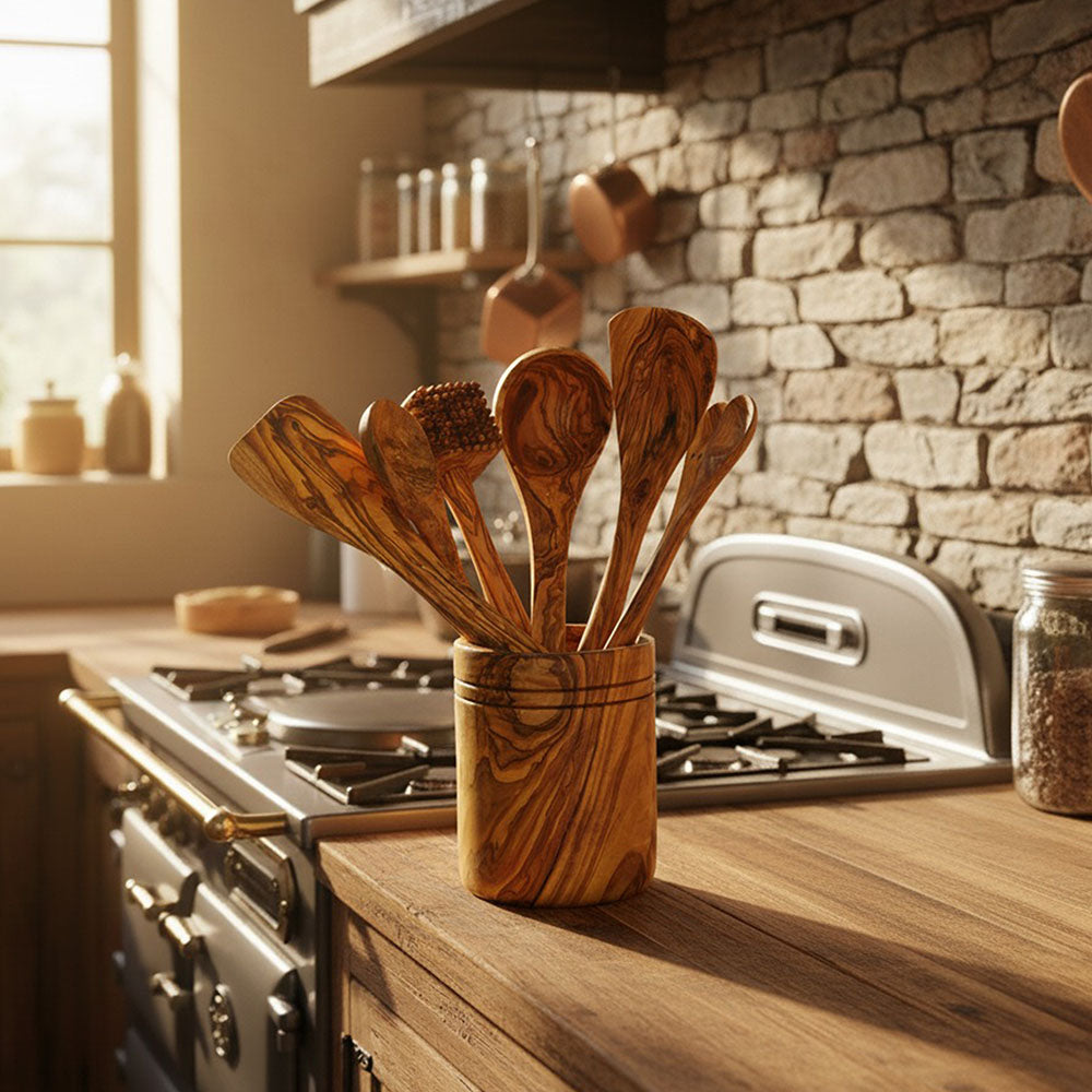 Los utensilios de cocina de madera de olivo son duraderos, antibacterianos y fáciles de cuidar. Simplemente límpialos con agua jabonosa suave y ocasionalmente trátalos con aceite de oliva.